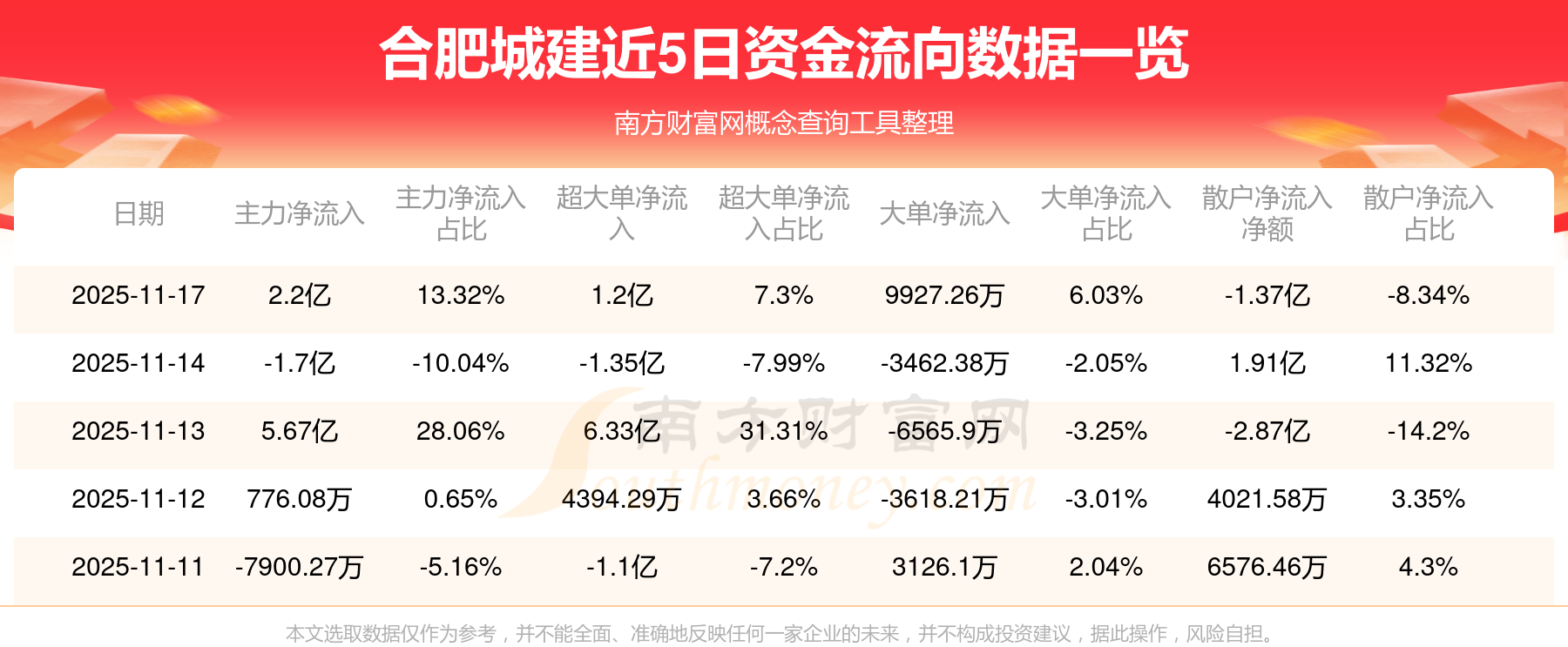 11月17日消息,合肥城建主力净流入2.2亿元,超大单净流入1.2亿元,散户净流出1.37亿元。