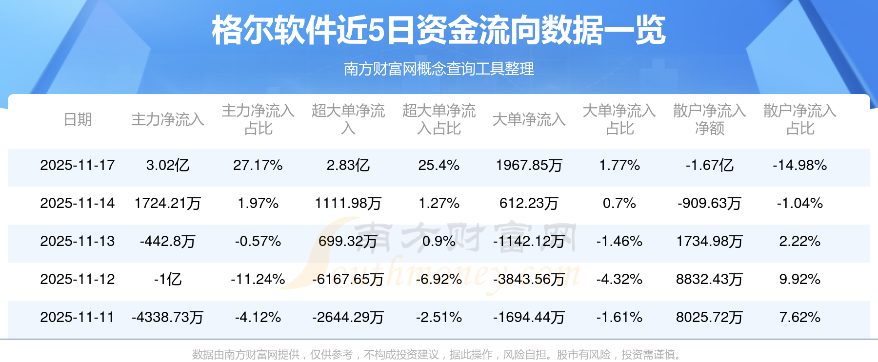 11月17日消息,格尔软件主力净流入3.02亿元,超大单净流入2.83亿元,散户净流出1.67亿元。
