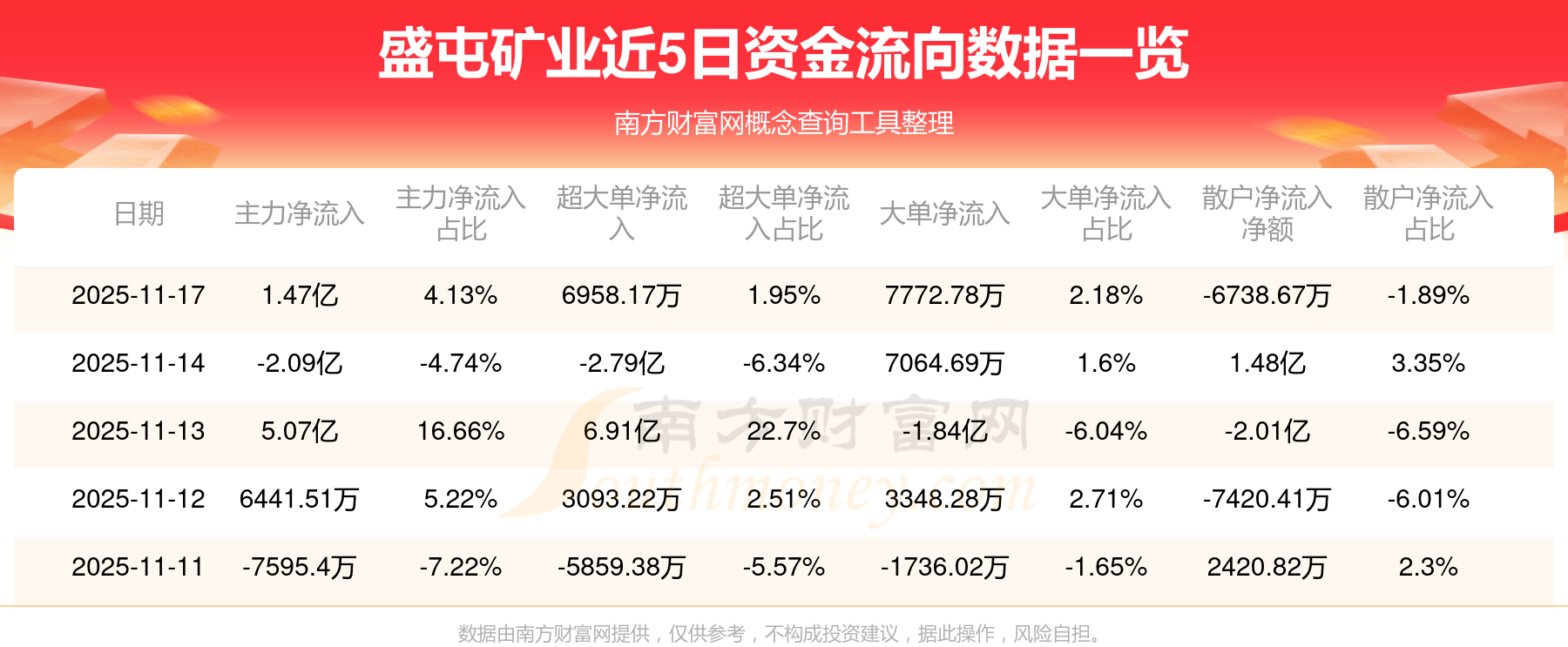 11月17日消息,盛屯矿业11月17日主力净流入1.47亿元,超大单净流入6958.17万元,大单净流入7772.78万元,散户净流出6738.67万元。