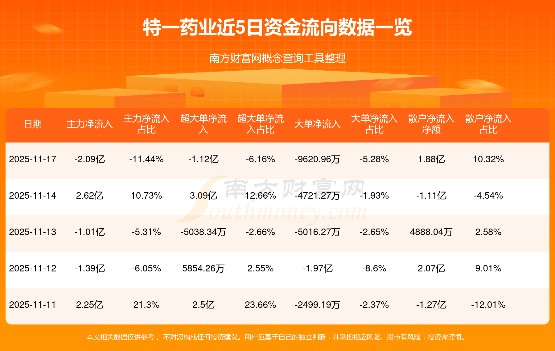 11月17日消息,特一药业11月17日主力资金净流出2.09亿元,超大单资金净流出1.12亿元,大单资金净流出9620.96万元,散户资金净流入1.88亿元。