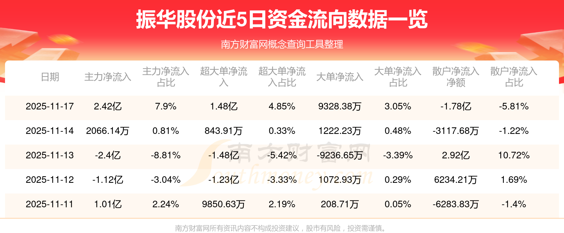 近5日资金流向一览见下表: