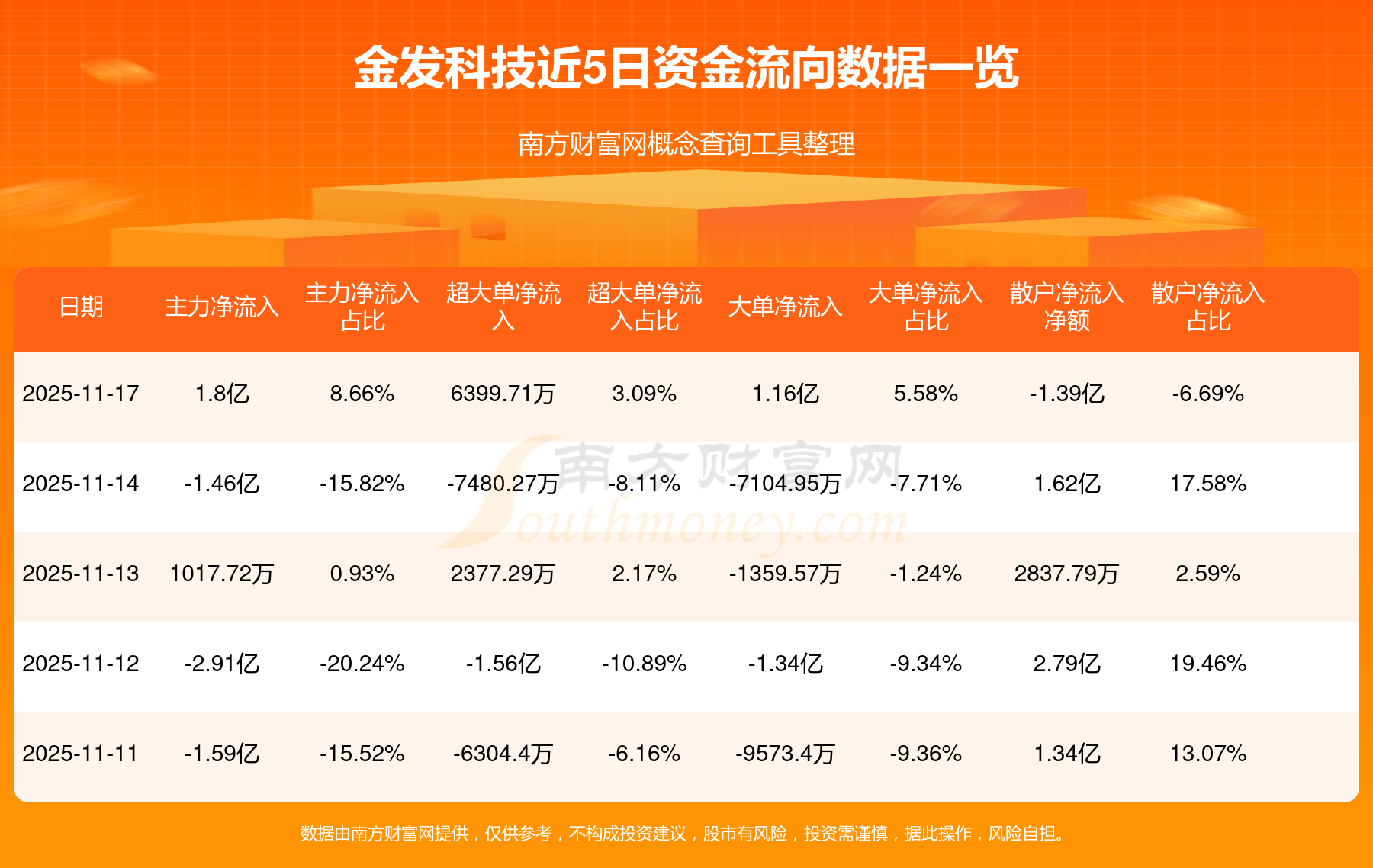 11月17日消息,金发科技资金净流入1.8亿元,超大单资金净流入6399.71万元,换手率1.77%,成交金额8.75亿元。