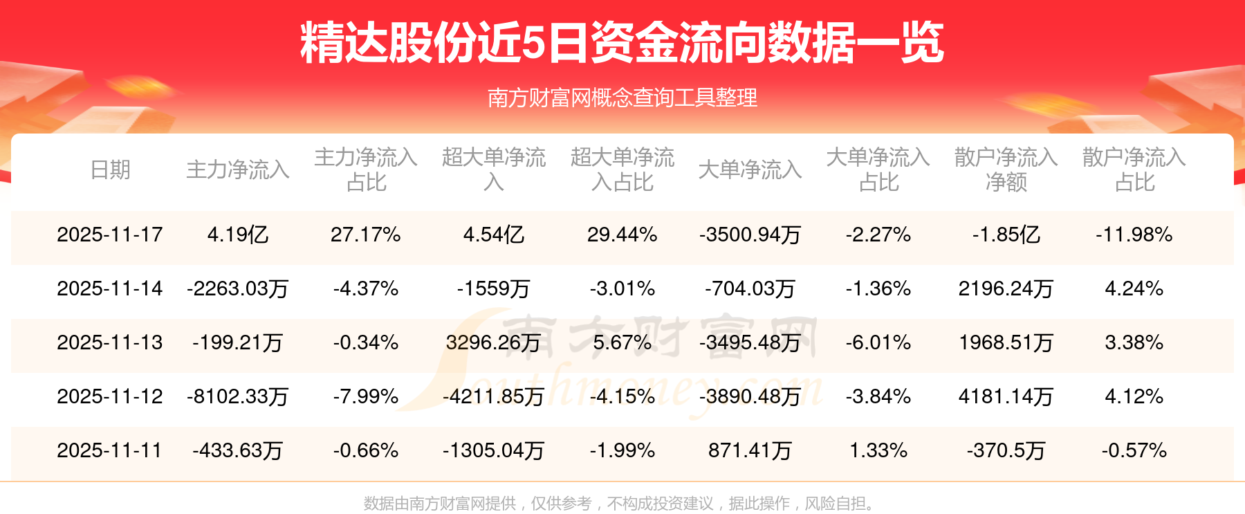 11月17日主力资金净流入4.19亿元,超大单资金净流入4.54亿元,换手率9.51%,成交金额23.48亿元。