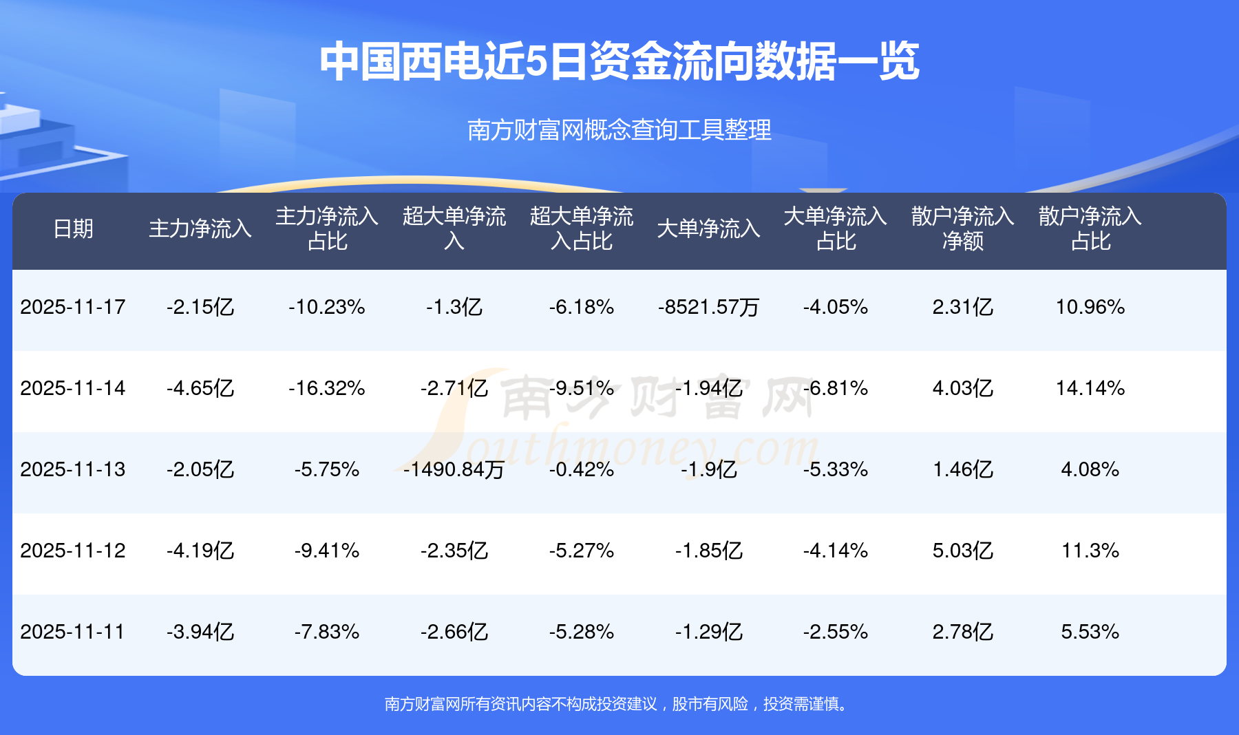 资金流向数据方面,11月17日主力资金净流流出2.15亿元,超大单资金净流出1.3亿元,大单资金净流出8521.57万元,散户资金净流入2.31亿元。