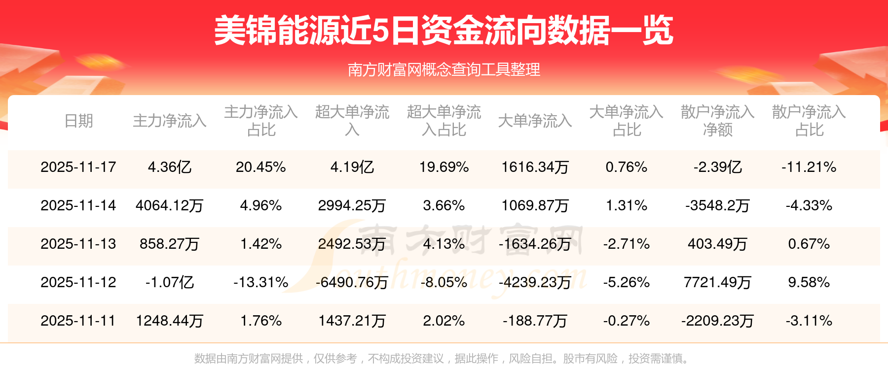 11月17日消息,美锦能源资金净流入4.36亿元,超大单资金净流入4.19亿元,换手率6.56%,成交金额16.29亿元。