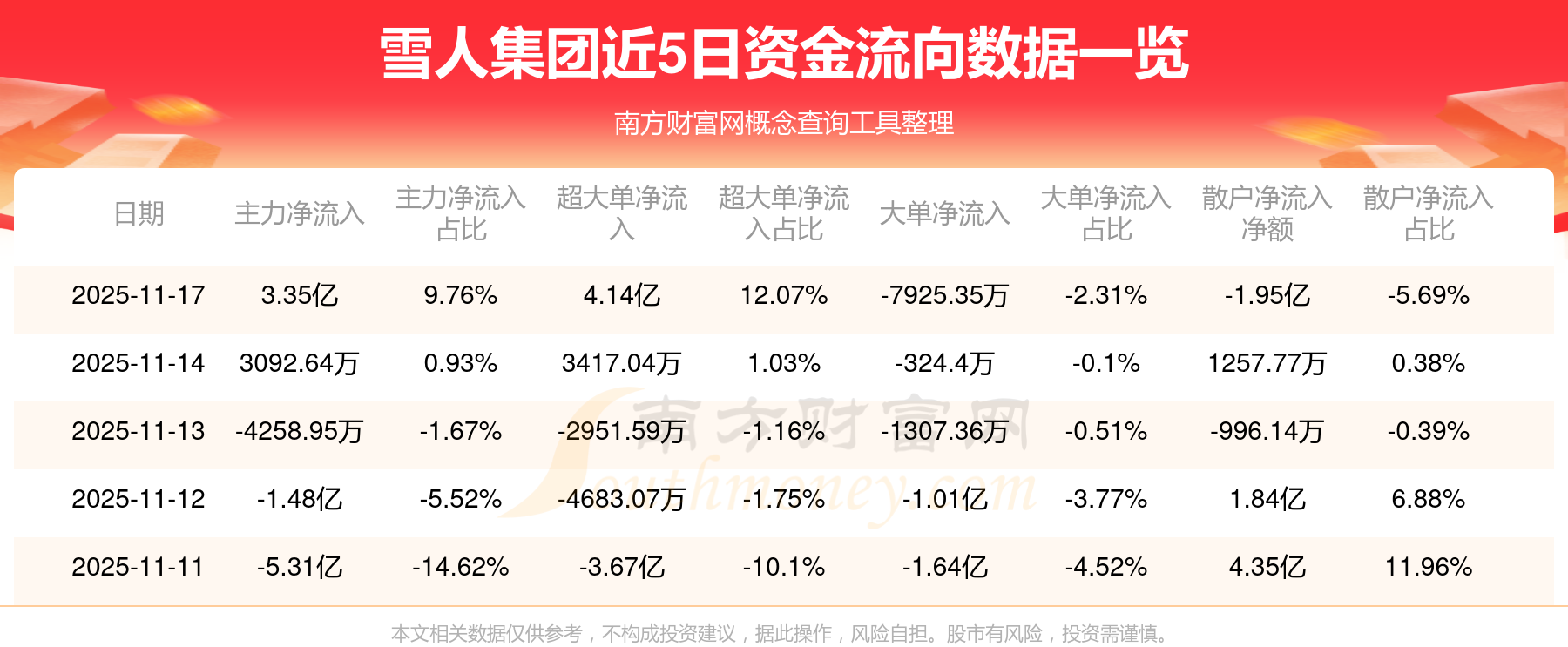 11月17日消息,雪人集团11月17日主力净流入3.35亿元,超大单净流入4.14亿元,大单净流出7925.35万元,散户净流出1.95亿元。