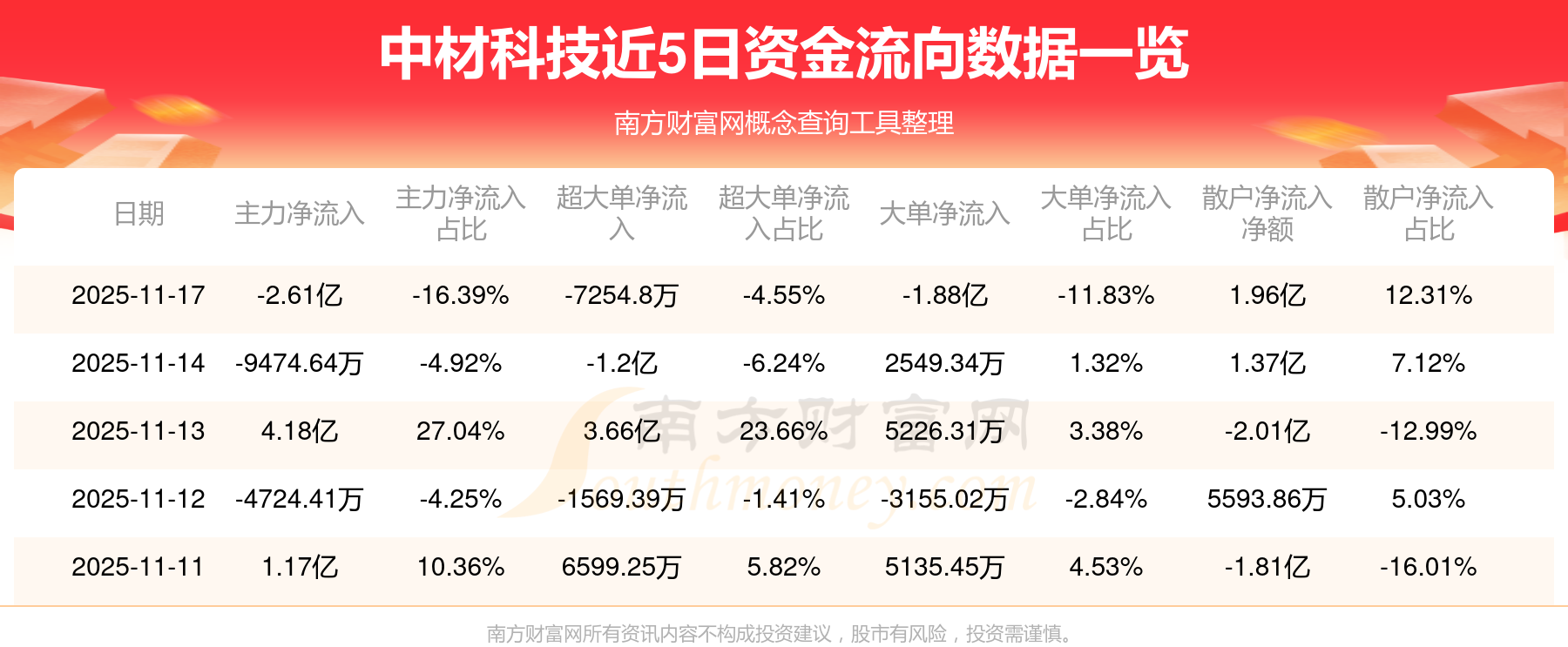11月17日消息,中材科技11月17日主力净流出2.61亿元,超大单净流出7254.8万元,大单净流出1.88亿元,散户净流入1.96亿元。