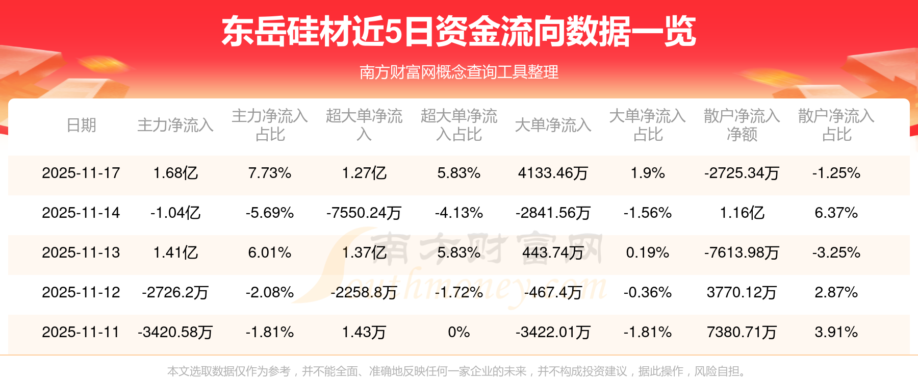 11月17日消息,东岳硅材资金净流入1.68亿元,超大单资金净流入1.27亿元,换手率12.47%,成交金额22.35亿元。