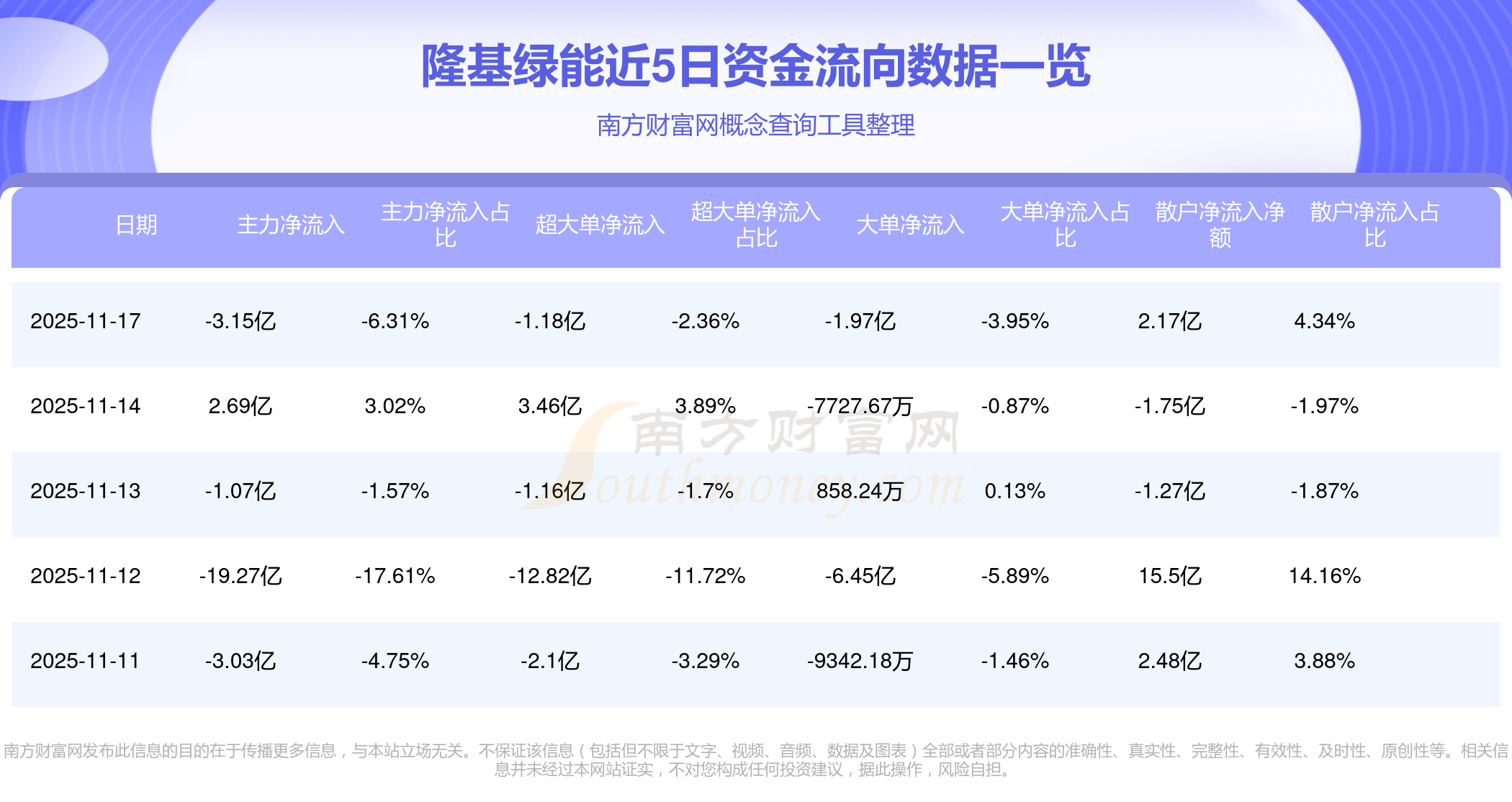 11月17日消息,隆基绿能主力净流出3.15亿元,超大单净流出1.18亿元,散户净流入2.17亿元。
