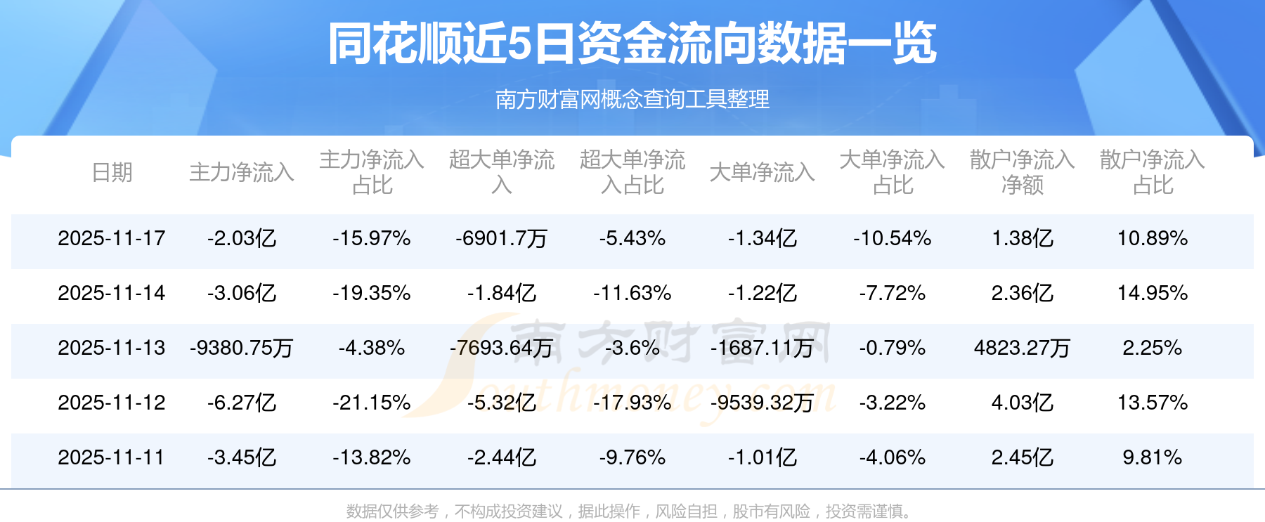 11月17日消息,同花顺主力净流出2.03亿元,超大单净流出6901.7万元,散户净流入1.38亿元。