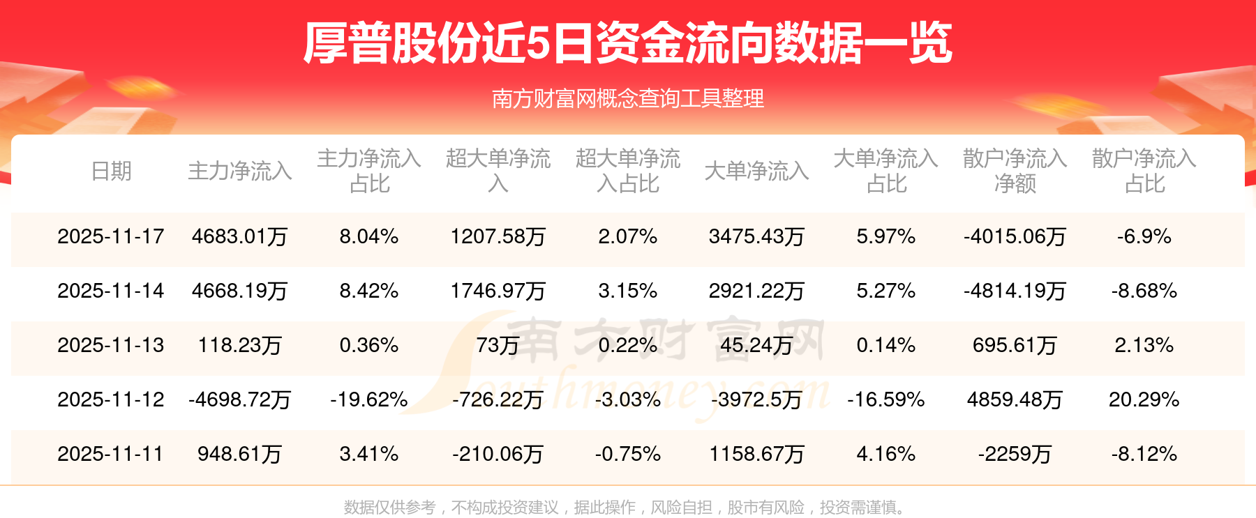 资金流向数据方面,11月17日主力资金净流流入4683.01万元,超大单资金净流入1207.58万元,大单资金净流入3475.43万元,散户资金净流出4015.06万元。