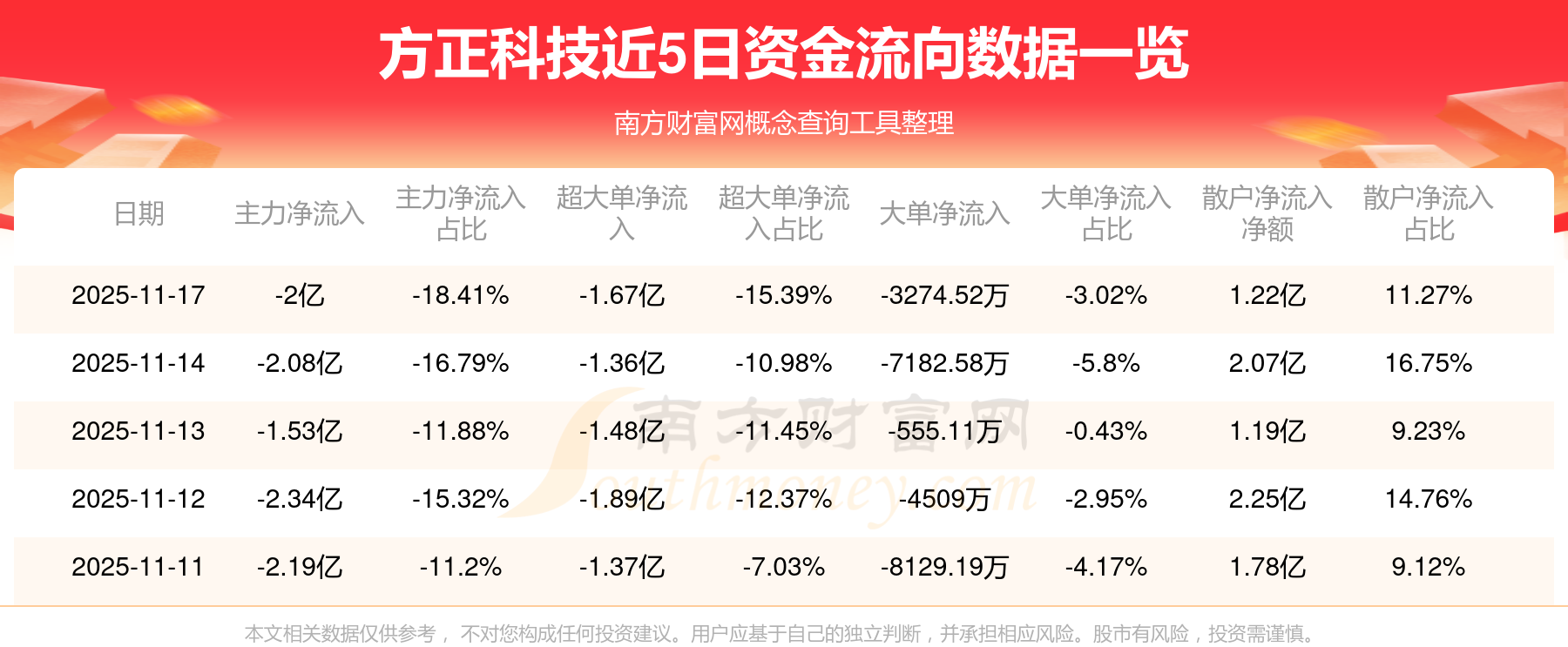 11月17日消息,方正科技主力净流出2亿元,超大单净流出1.67亿元,散户净流入1.22亿元。