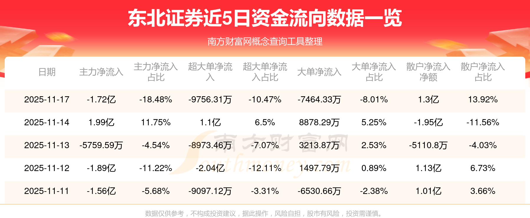 11月17日消息,东北证券11月17日主力资金净流出1.72亿元,超大单资金净流出9756.31万元,大单资金净流出7464.33万元,散户资金净流入1.3亿元。