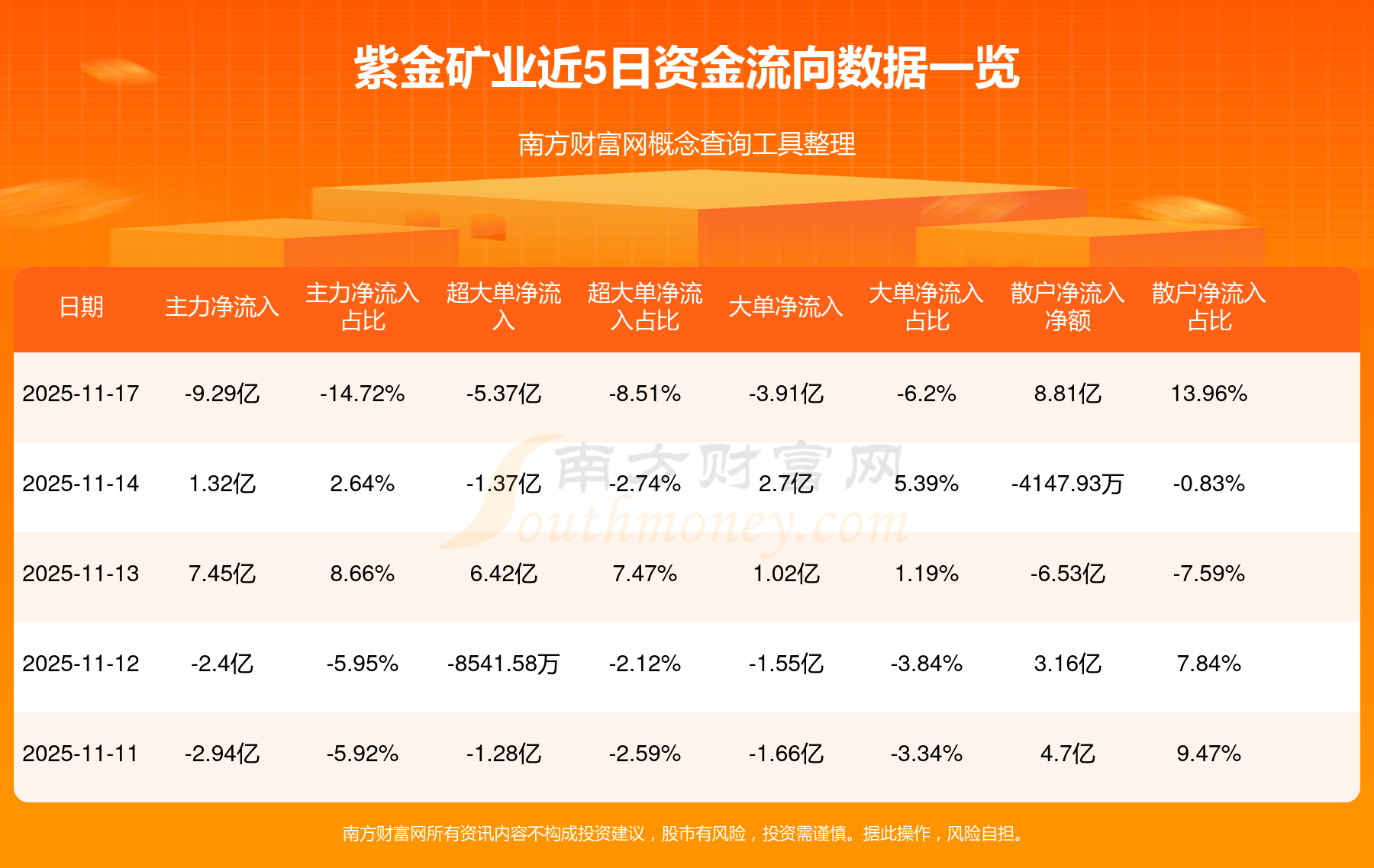 11月17日消息,紫金矿业资金净流出9.29亿元,超大单资金净流出5.37亿元,换手率0.84%,成交金额49.46亿元。