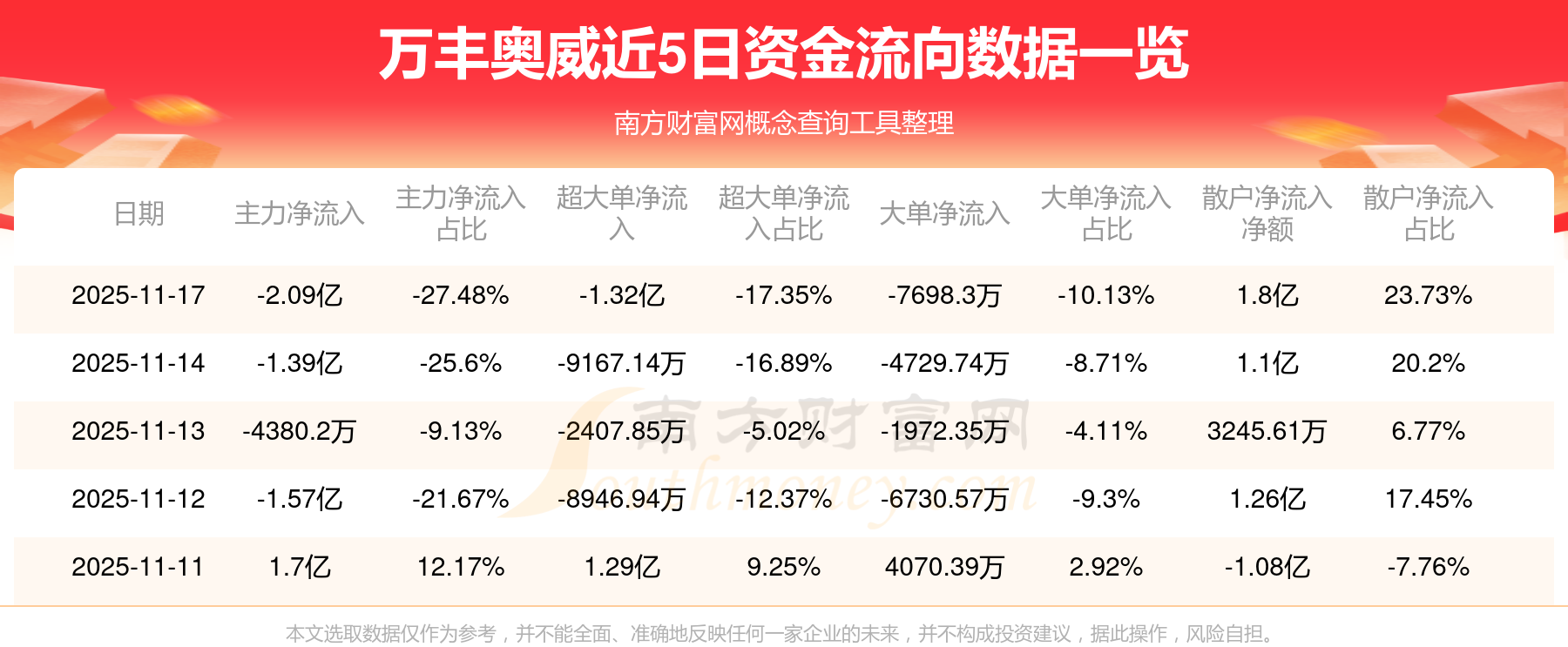 11月17日消息,万丰奥威资金净流出2.09亿元,超大单净流出1.32亿元,换手率1.43%,成交金额4.79亿元。