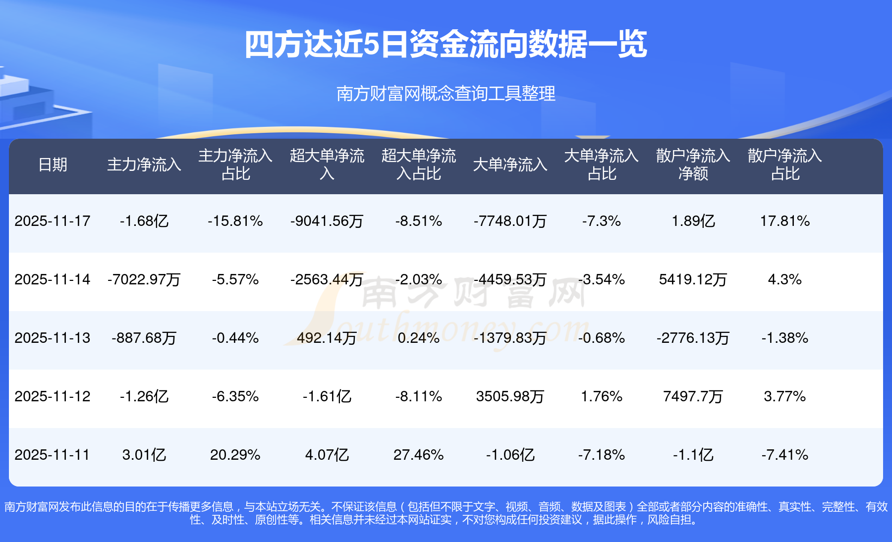 11月17日消息,四方达资金净流出1.68亿元,超大单资金净流出9041.56万元,换手率10.07%,成交金额6.09亿元。