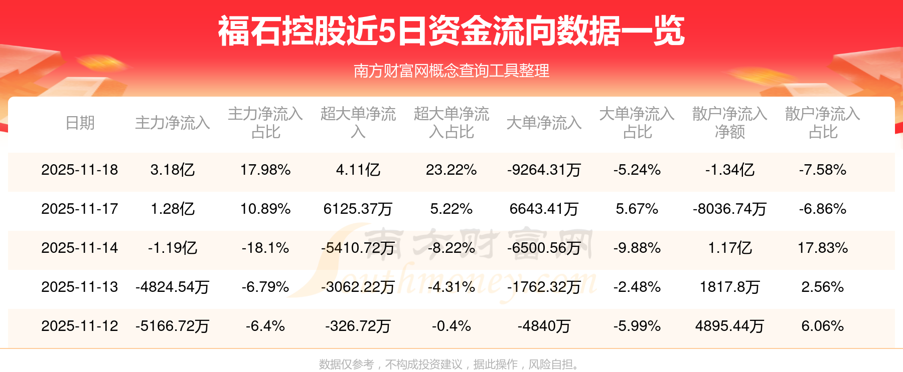 11月18日消息,福石控股资金净流入3.18亿元,超大单净流入4.11亿元,换手率29.52%,成交金额17.68亿元。