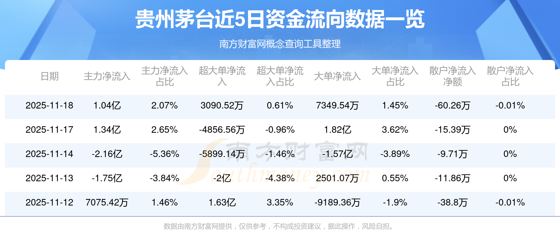 11月18日消息,贵州茅台11月18日主力净流入1.04亿元,超大单净流入3090.52万元,大单净流入7349.54万元,散户净流出60.26万元。