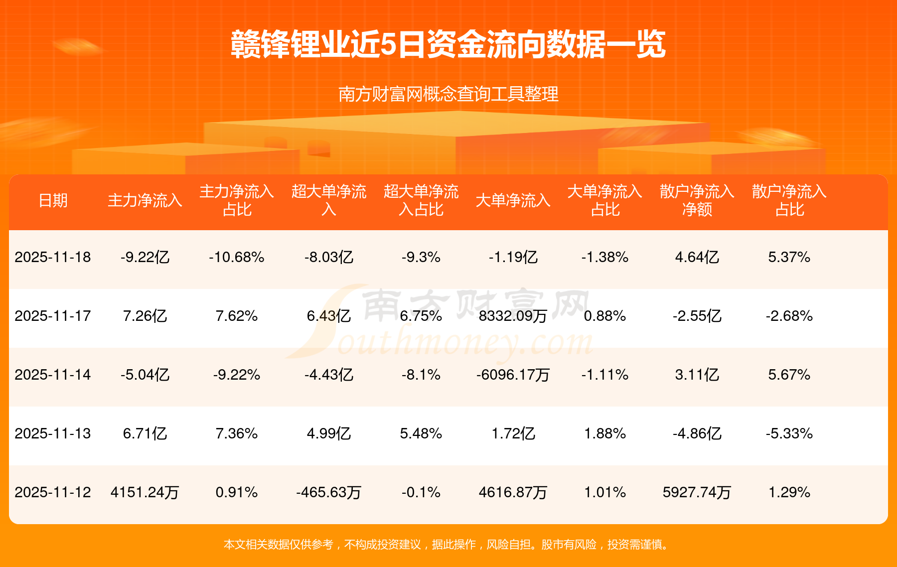 11月18日消息,赣锋锂业11月18日主力净流出9.22亿元,超大单净流出8.03亿元,大单净流出1.19亿元,散户净流入4.64亿元。