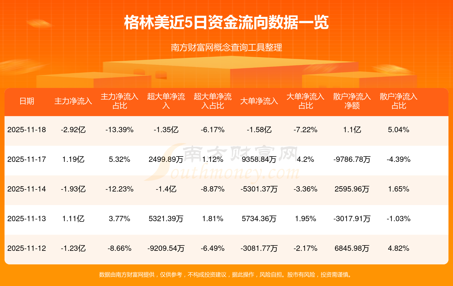 资金流向数据方面,11月18日主力资金净流流出2.92亿元,超大单资金净流出1.35亿元,大单资金净流出1.58亿元,散户资金净流入1.1亿元。