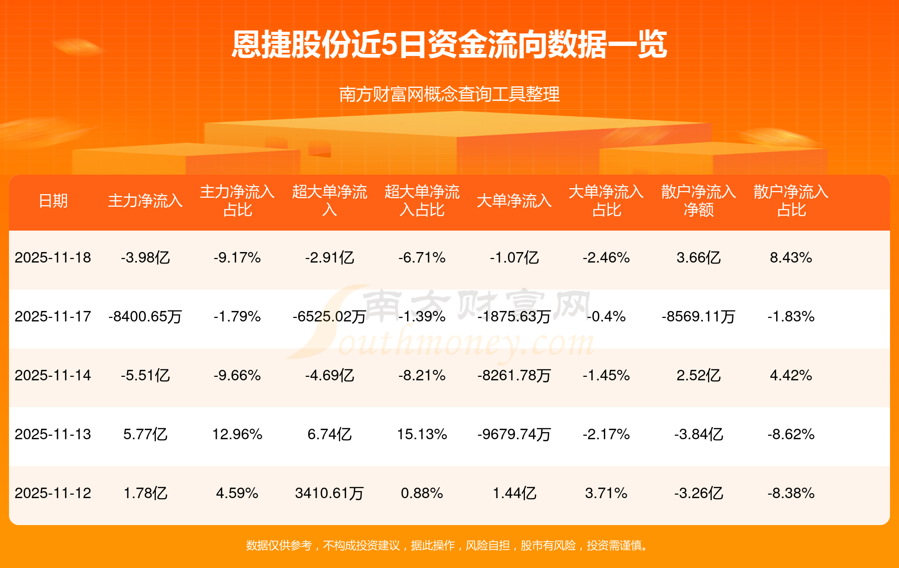 11月18日消息,恩捷股份主力资金净流出3.98亿元,超大单资金净流出2.91亿元,散户资金净流入3.66亿元。