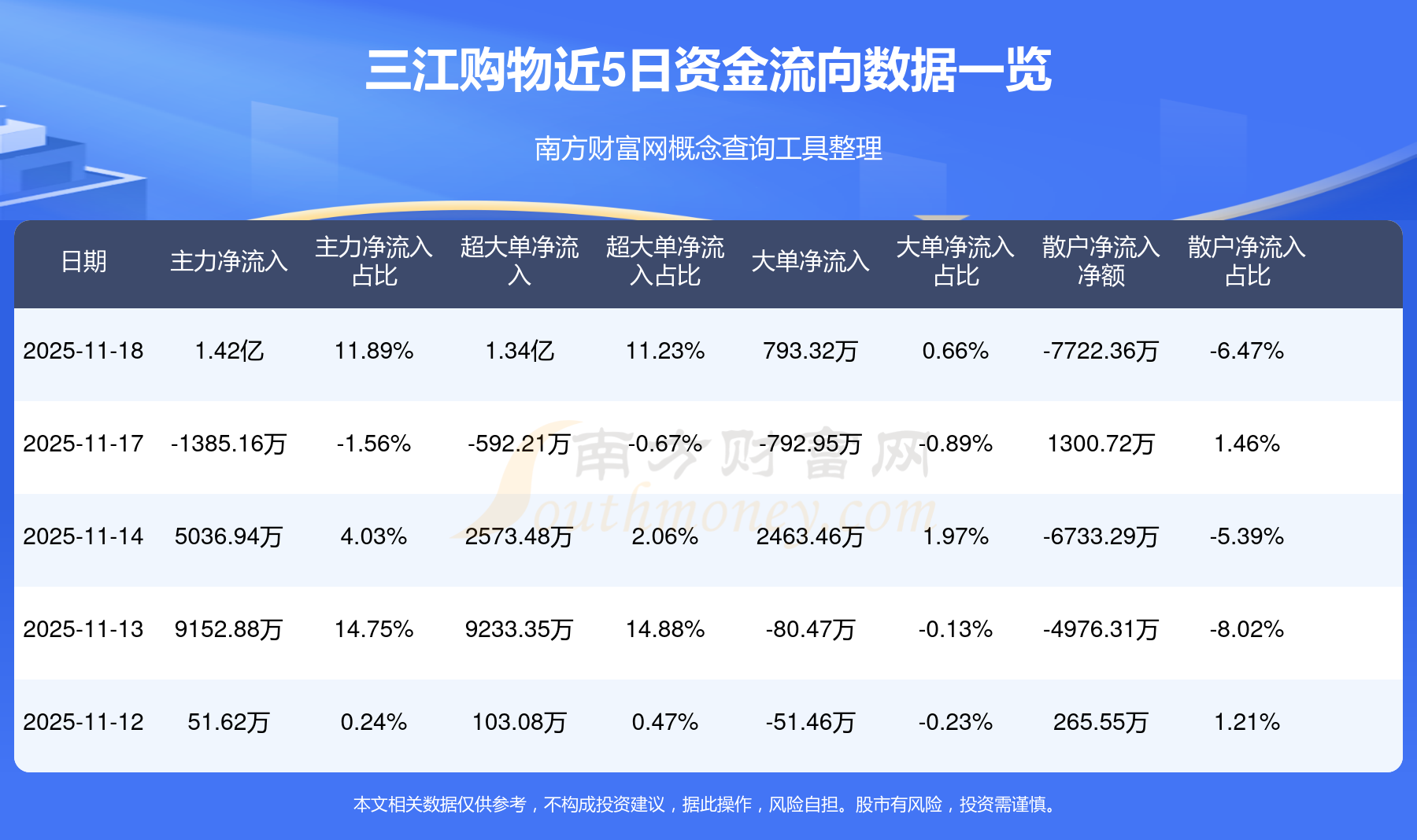 11月18日消息,三江购物主力净流入1.42亿元,超大单净流入1.34亿元,散户净流出7722.36万元。