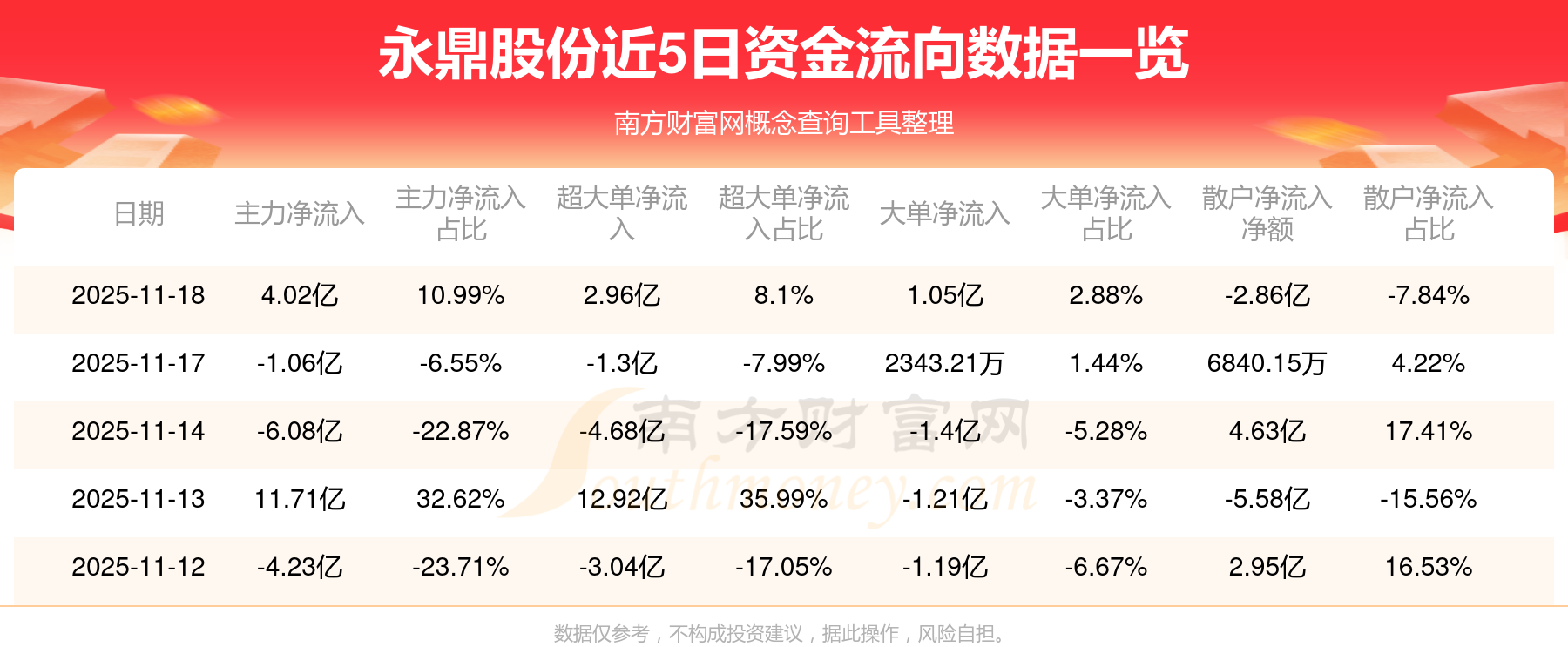 11月18日消息,永鼎股份11月18日主力净流入4.02亿元,超大单净流入2.96亿元,大单净流入1.05亿元,散户净流出2.86亿元。