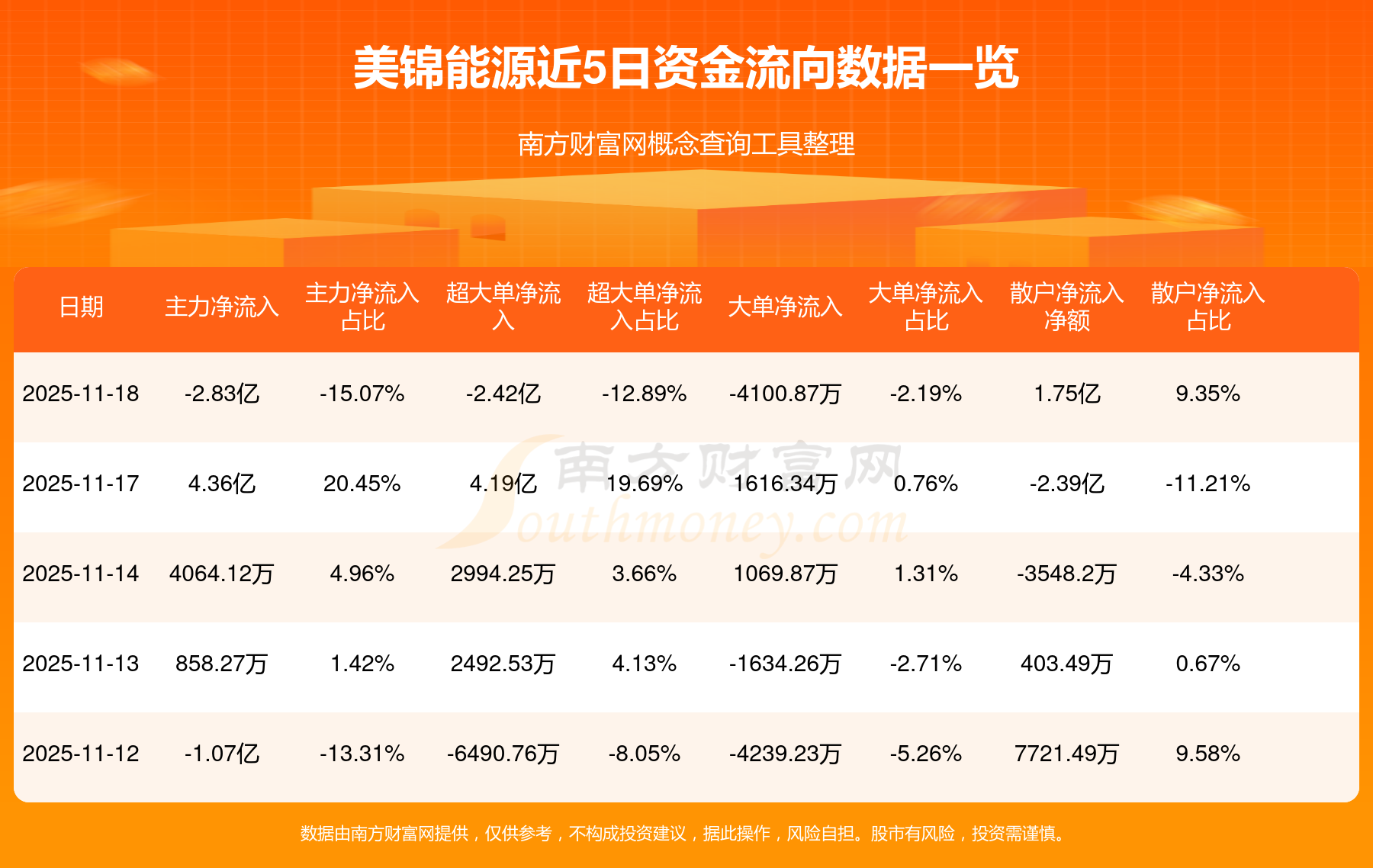 11月18日消息,美锦能源主力净流出2.83亿元,超大单净流出2.42亿元,散户净流入1.75亿元。
