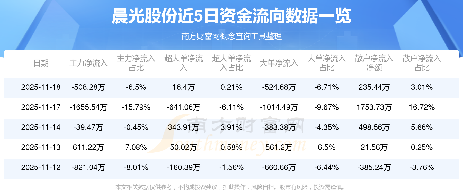 11月18日消息,晨光股份11月18日主力净流出508.28万元,超大单净流入16.4万元,大单净流出524.68万元,散户净流入235.44万元。
