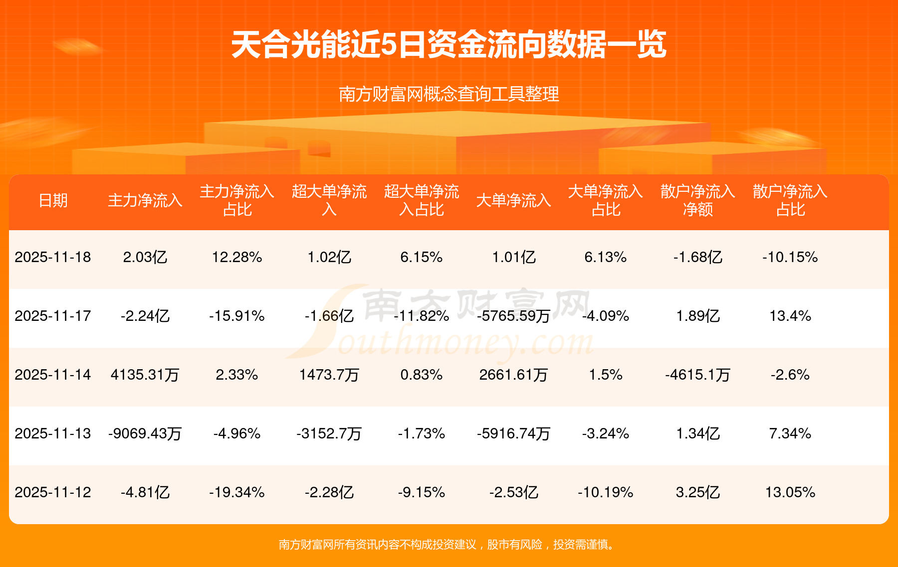 11月18日消息,天合光能主力净流入2.03亿元,超大单净流入1.02亿元,散户净流出1.68亿元。