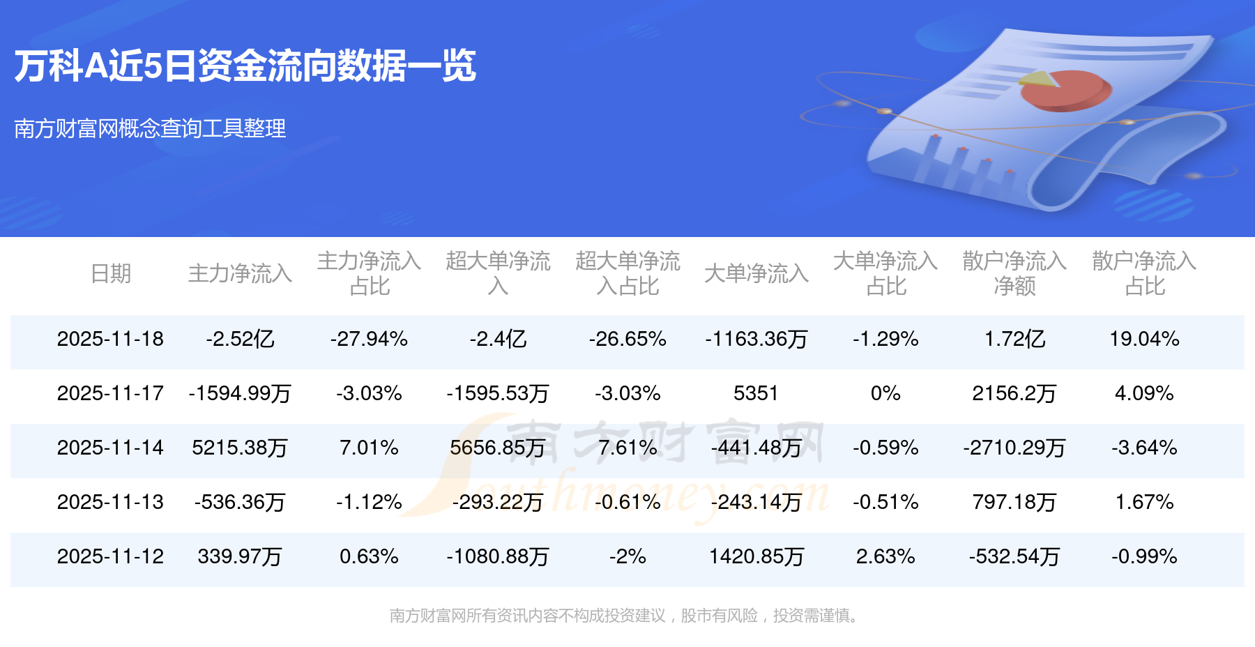 11月18日消息,万科A资金净流出2.52亿元,超大单净流出2.4亿元,换手率1.5%,成交金额9.02亿元。