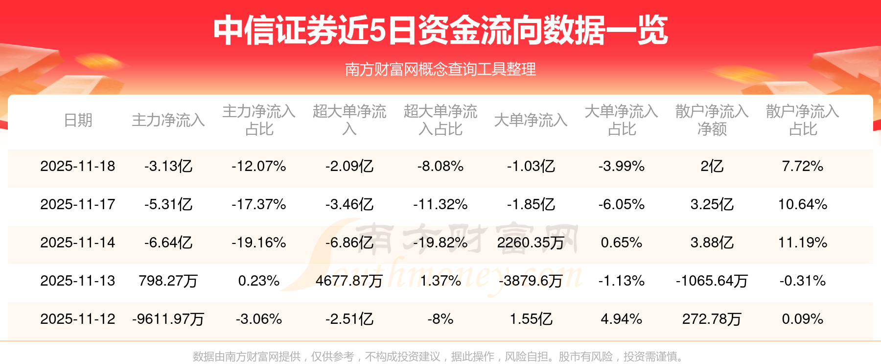 11月18日消息,中信证券资金净流出3.13亿元,超大单净流出2.09亿元,换手率0.75%,成交金额25.89亿元。