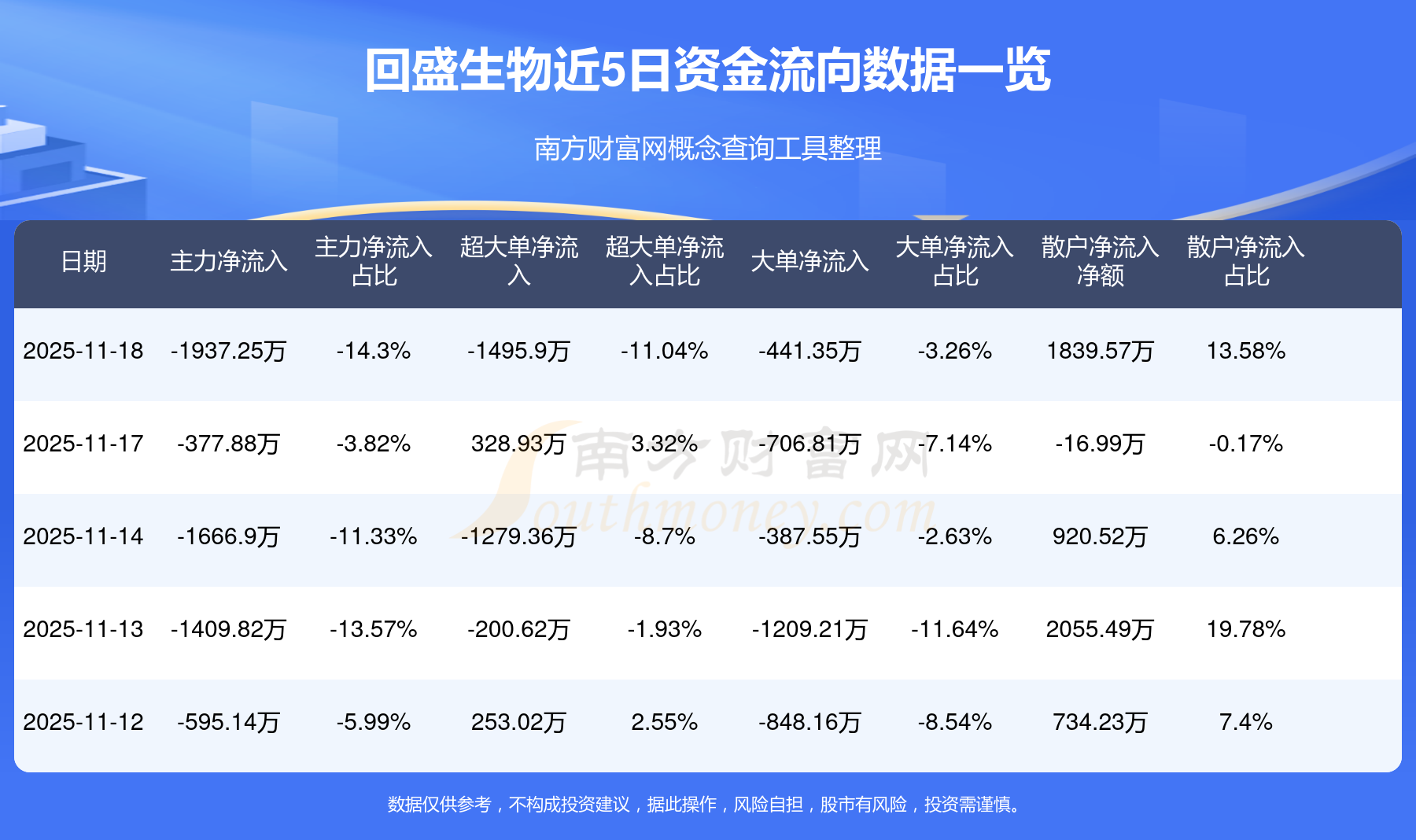 11月18日消息,回盛生物11月18日主力净流出1937.25万元,超大单净流出1495.9万元,大单净流出441.35万元,散户净流入1839.57万元。