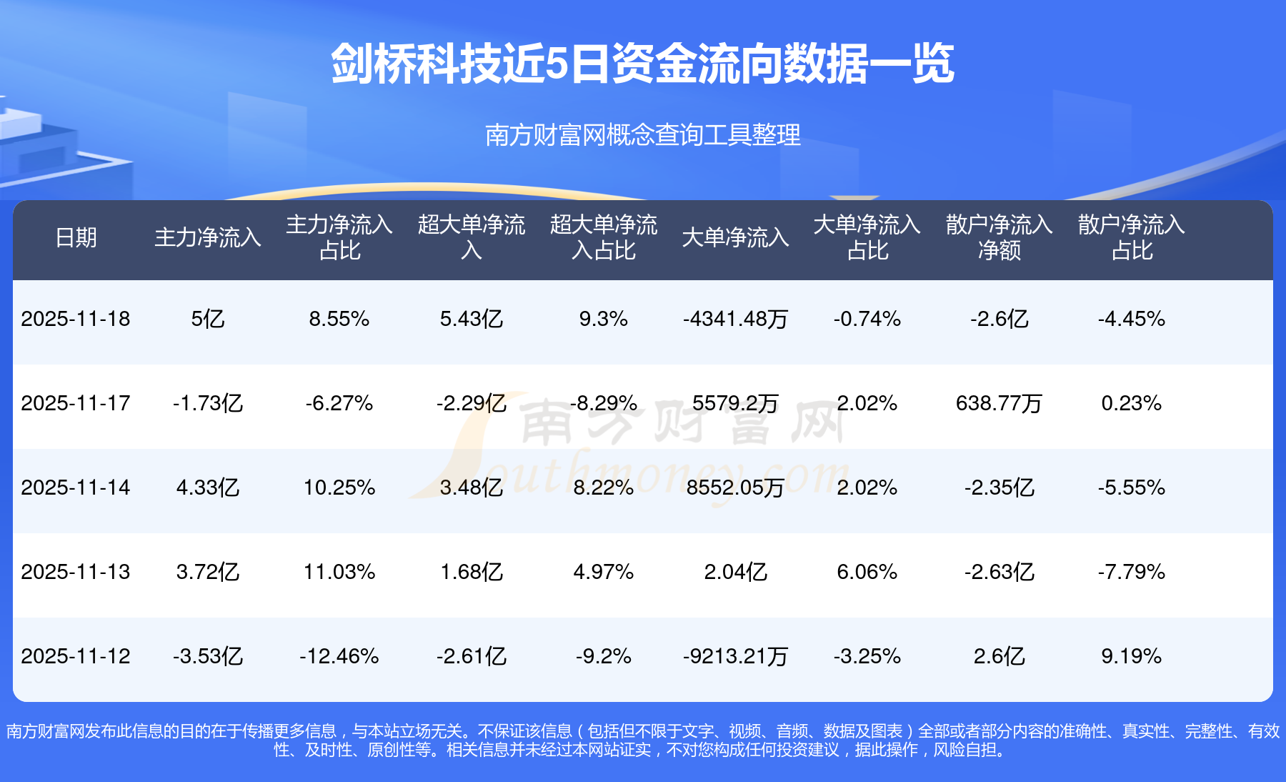 11月18日消息,剑桥科技资金净流入5亿元,超大单资金净流入5.43亿元,换手率19.15%,成交金额58.4亿元。