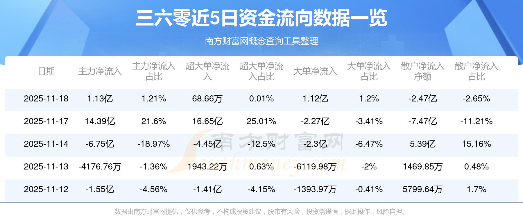 11月18日消息,三六零资金净流入1.13亿元,超大单净流入68.66万元,换手率9.67%,成交金额93.37亿元。