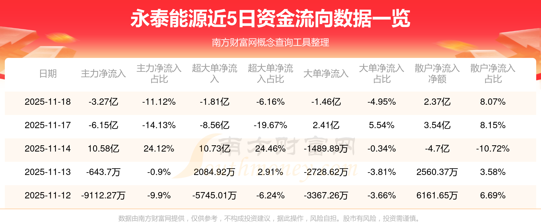 11月18日消息,永泰能源主力净流出3.27亿元,超大单净流出1.81亿元,散户净流入2.37亿元。