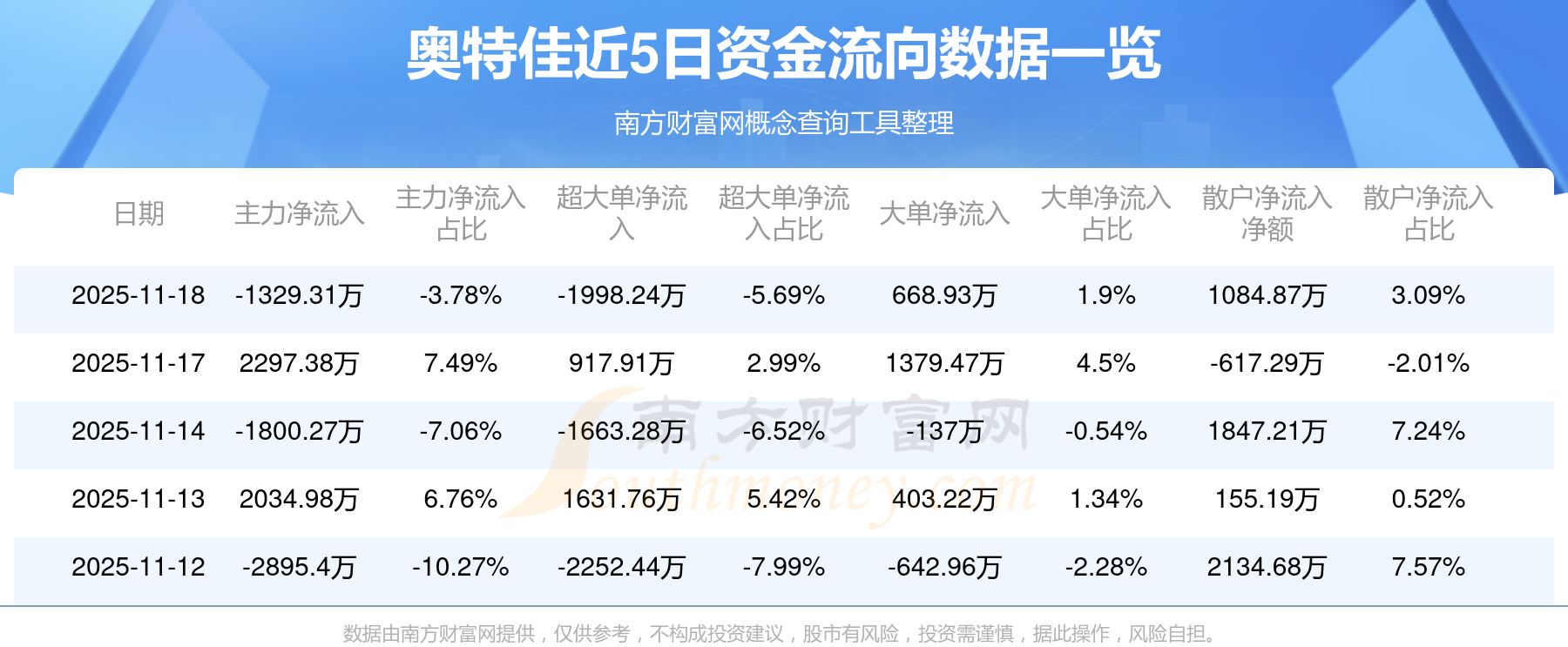 11月18日消息,奥特佳主力净流出1329.31万元,超大单净流出1998.24万元,散户净流入1084.87万元。