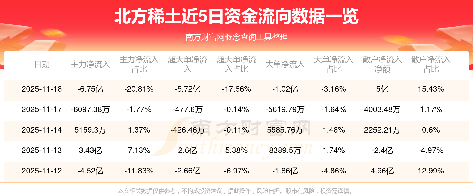 11月18日消息,北方稀土11月18日主力净流出6.75亿元,超大单净流出5.72亿元,大单净流出1.02亿元,散户净流入5亿元。