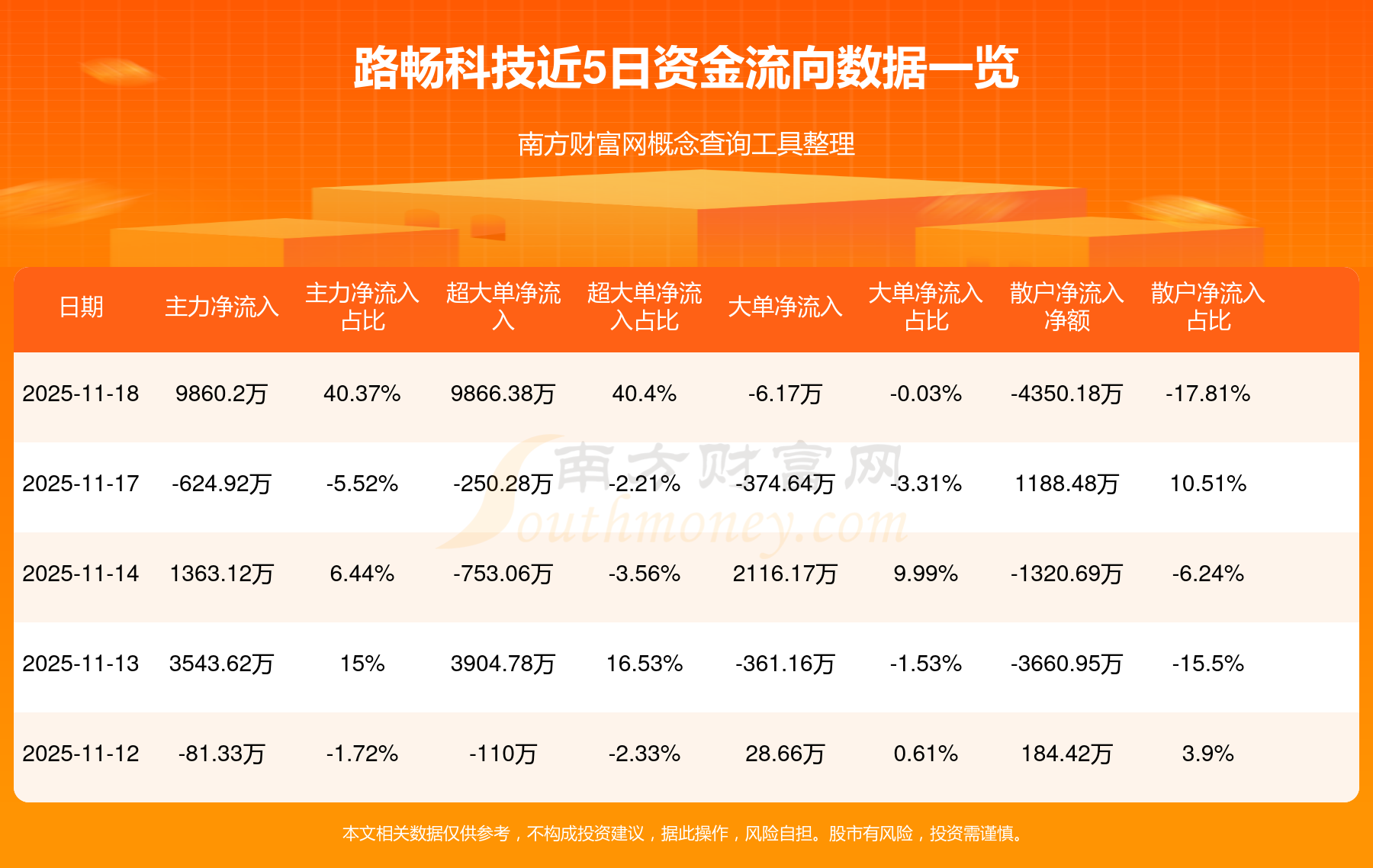 11月18日消息,路畅科技资金净流入9860.2万元,超大单净流入9866.38万元,换手率7.02%,成交金额2.44亿元。