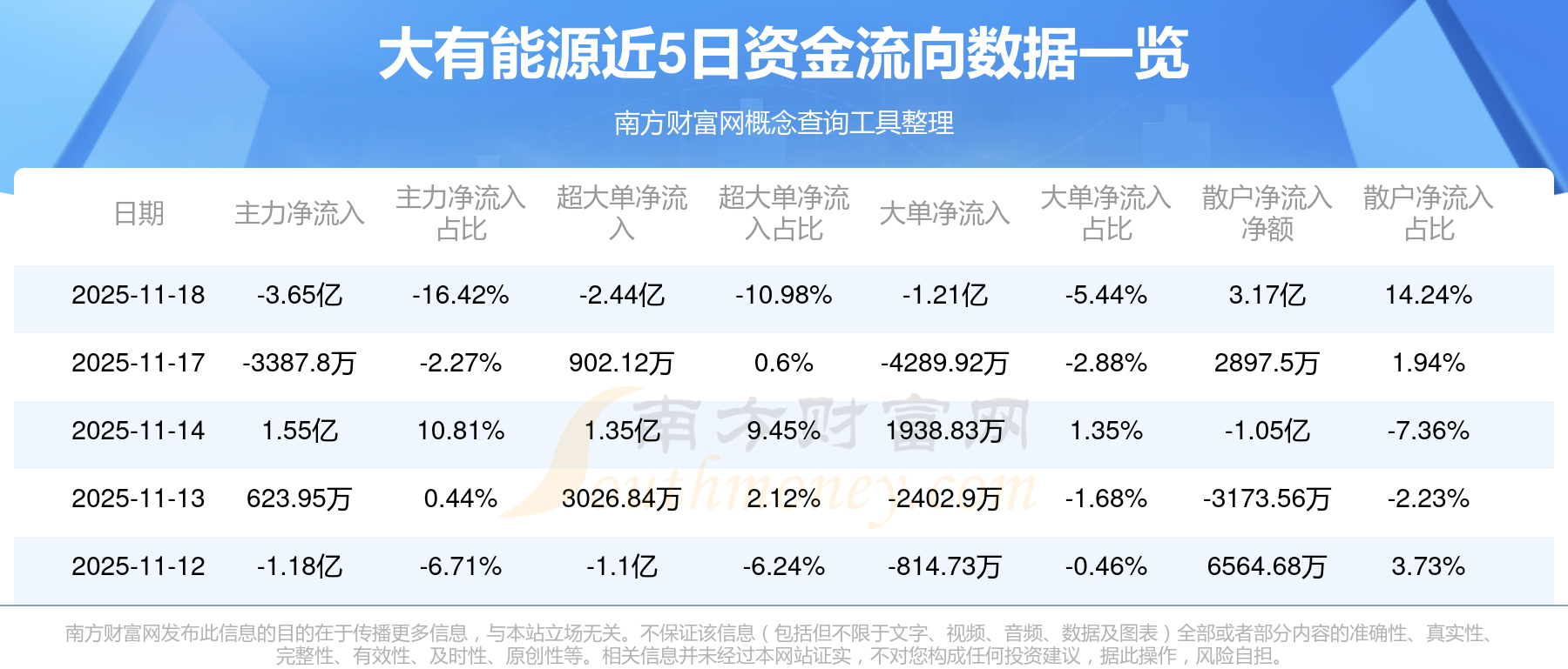 11月18日消息,大有能源资金净流出3.65亿元,超大单资金净流出2.44亿元,换手率8.38%,成交金额22.23亿元。