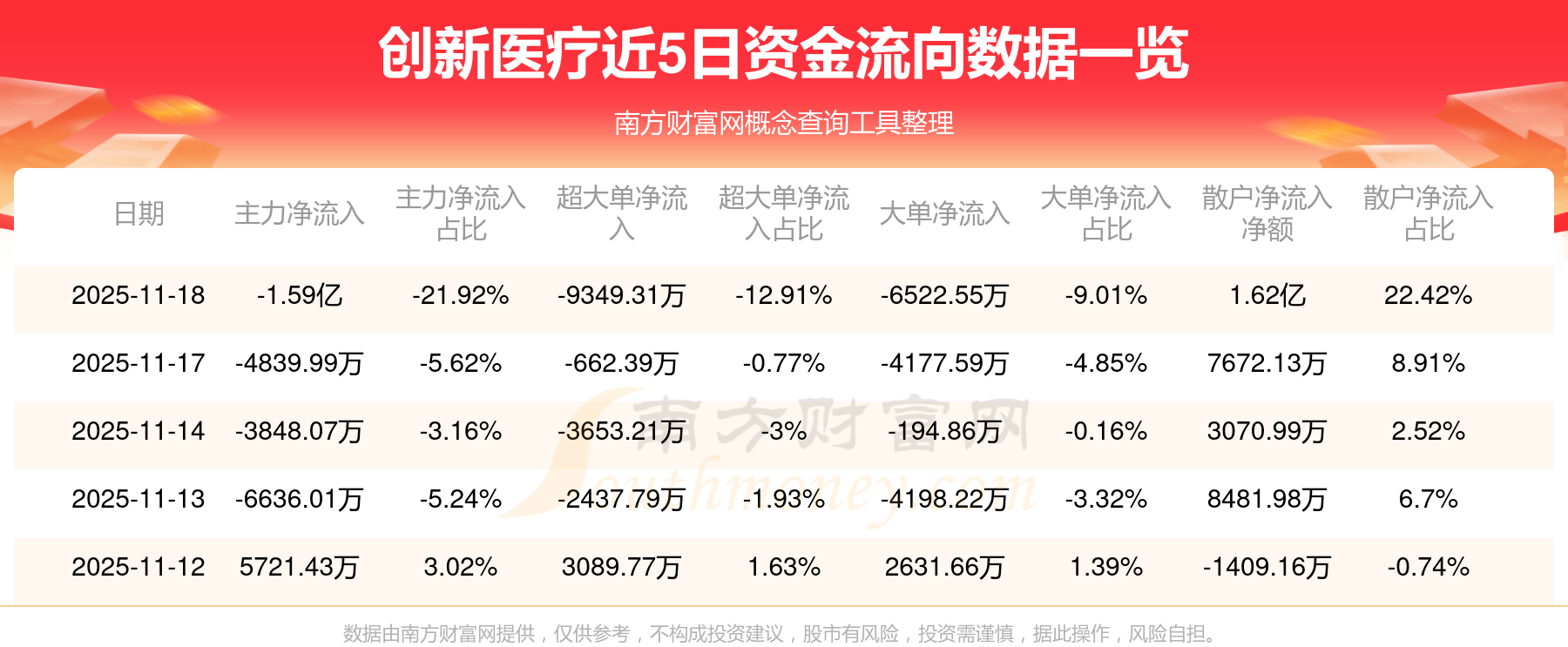 11月18日消息,创新医疗资金净流出1.59亿元,超大单资金净流出9349.31万元,换手率7.92%,成交金额7.24亿元。