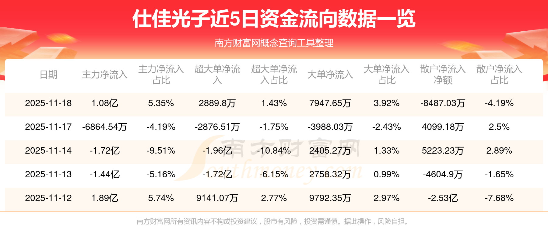 11月18日消息,仕佳光子11月18日主力资金净流入1.08亿元,超大单资金净流入2889.8万元,大单资金净流入7947.65万元,散户资金净流出8487.03万元。