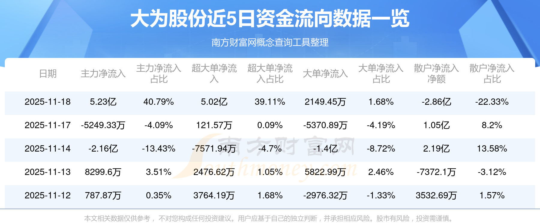 11月18日消息,大为股份资金净流入5.23亿元,超大单资金净流入5.02亿元,换手率20.88%,成交金额12.83亿元。