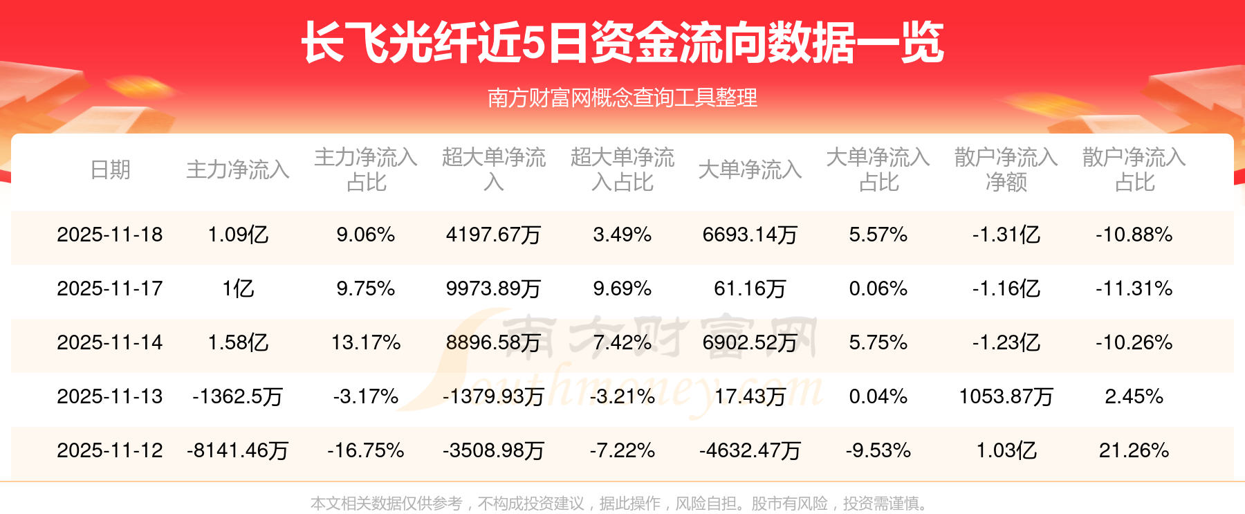 11月18日消息,长飞光纤主力净流入1.09亿元,超大单净流入4197.67万元,散户净流出1.31亿元。