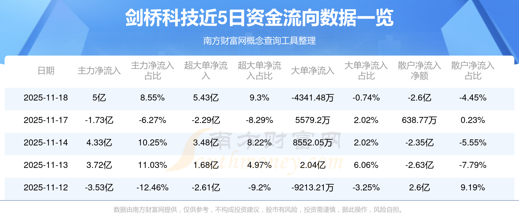 11月18日消息,资金净流入5亿元,超大单净流入5.43亿元,成交金额58.4亿元。