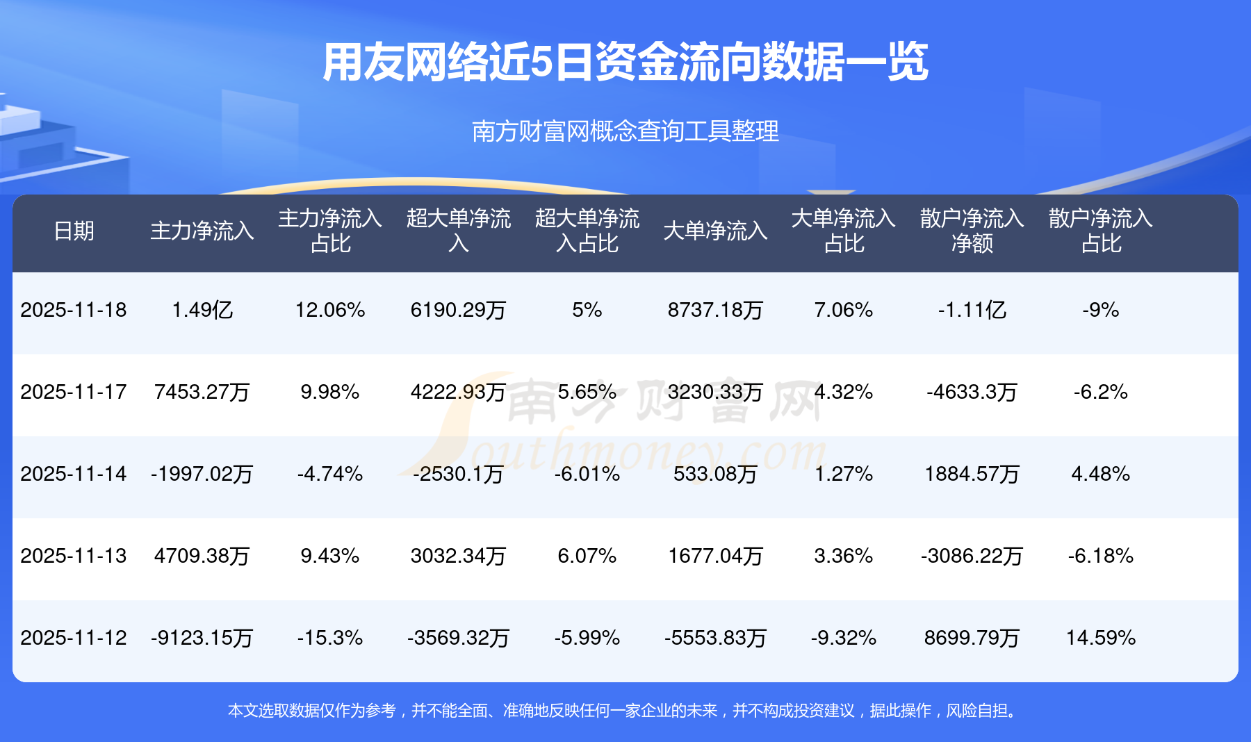 11月14日消息,截至15点收盘用友网络跌1.04%,报14.960元,换手率2.42%,成交量8284.87万手,成交额12.38亿元。