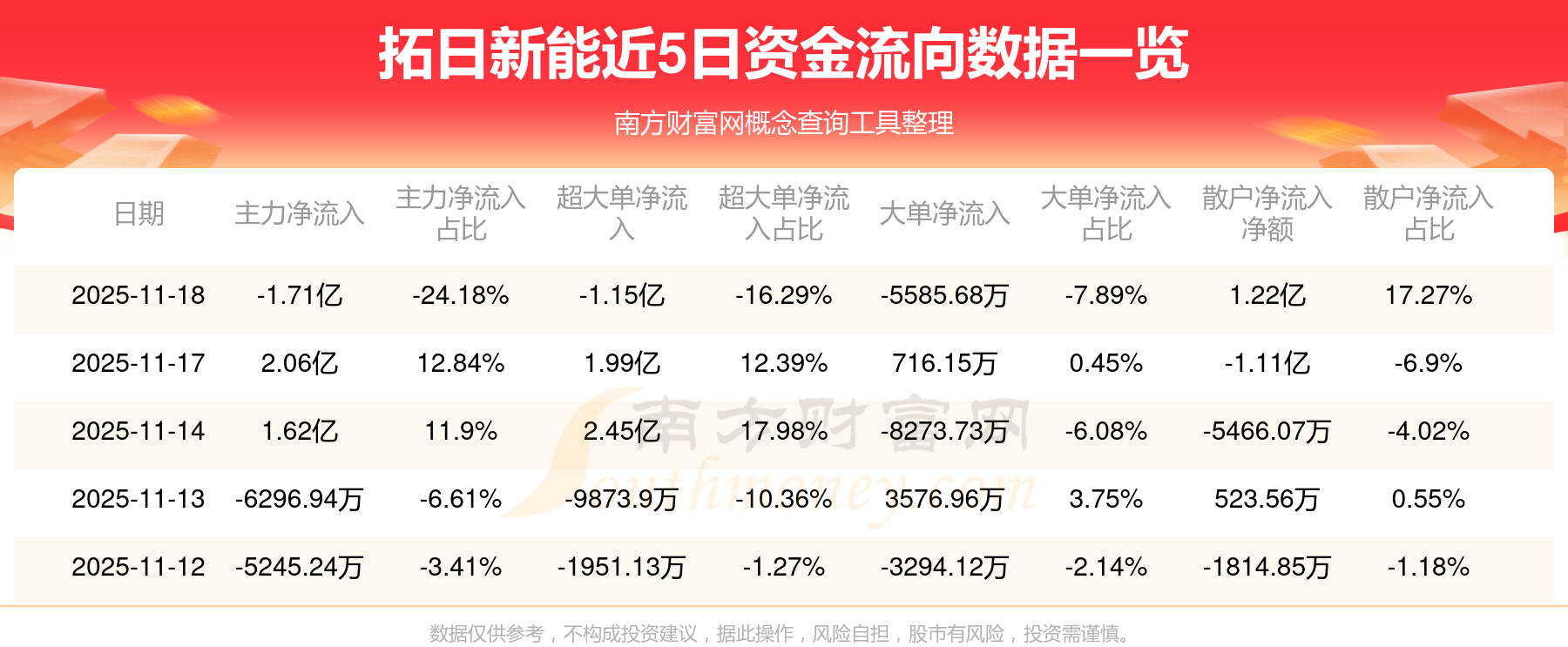 11月18日消息,拓日新能主力资金净流出1.71亿元,超大单资金净流出1.15亿元,散户资金净流入1.22亿元。