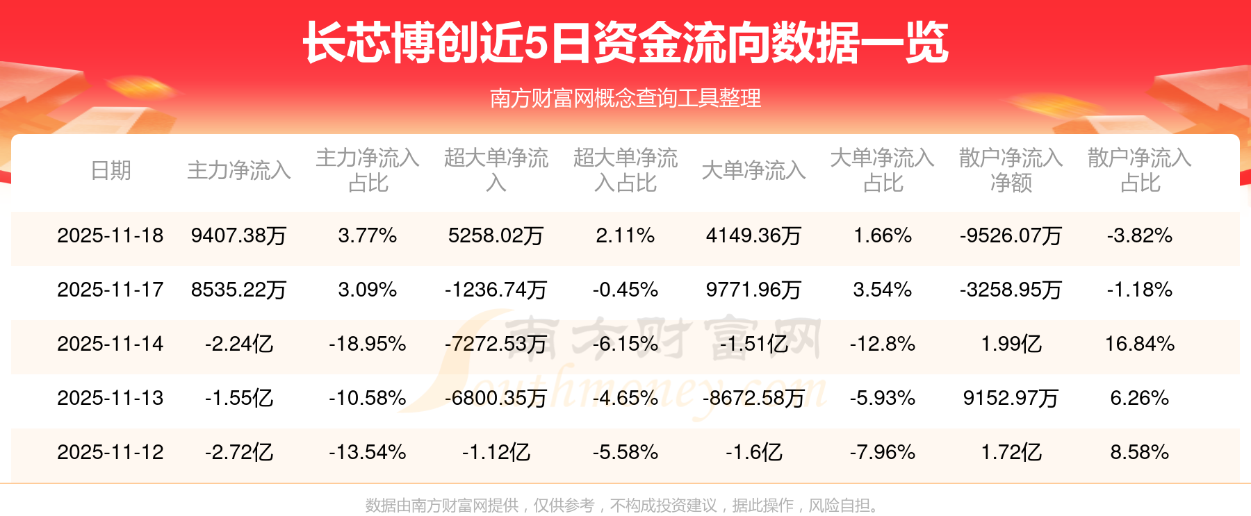11月18日消息,长芯博创11月18日主力净流入9407.38万元,超大单净流入5258.02万元,大单净流入4149.36万元,散户净流出9526.07万元。