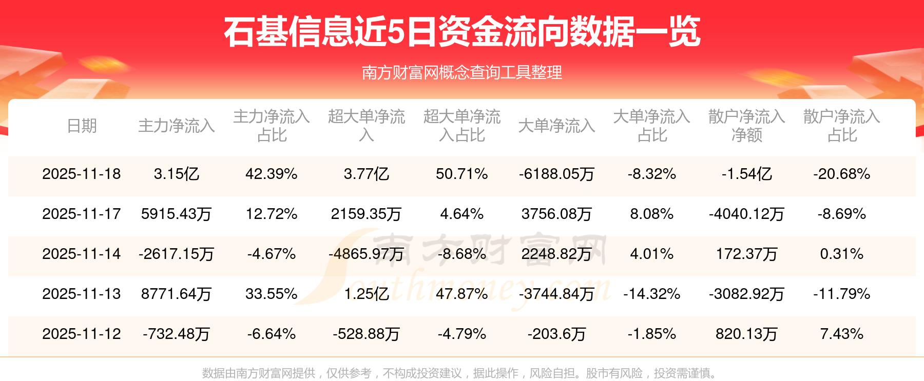 11月18日消息,石基信息主力净流入3.15亿元,超大单净流入3.77亿元,散户净流出1.54亿元。