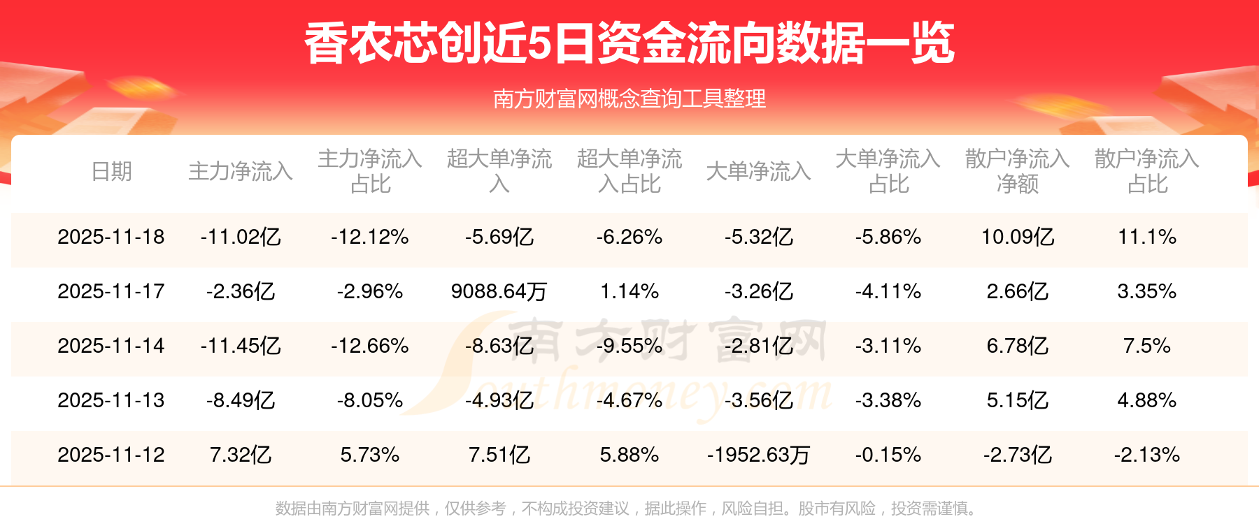 11月18日消息,香农芯创主力资金净流出11.02亿元,超大单资金净流出5.69亿元,散户资金净流入10.09亿元。